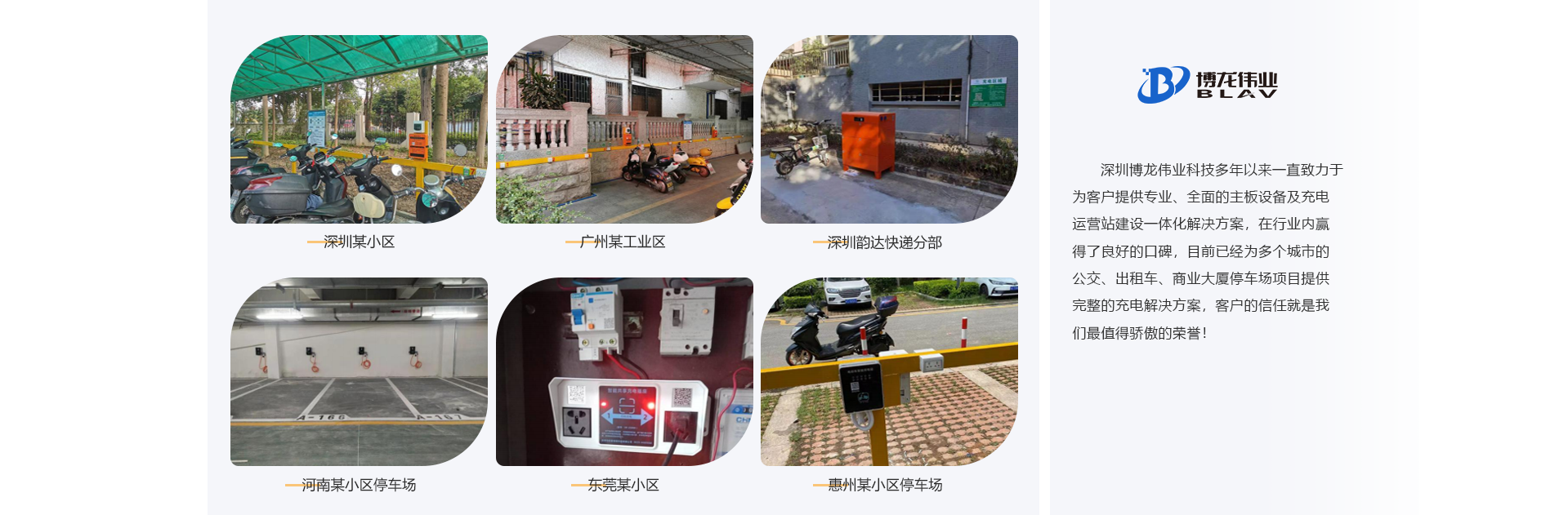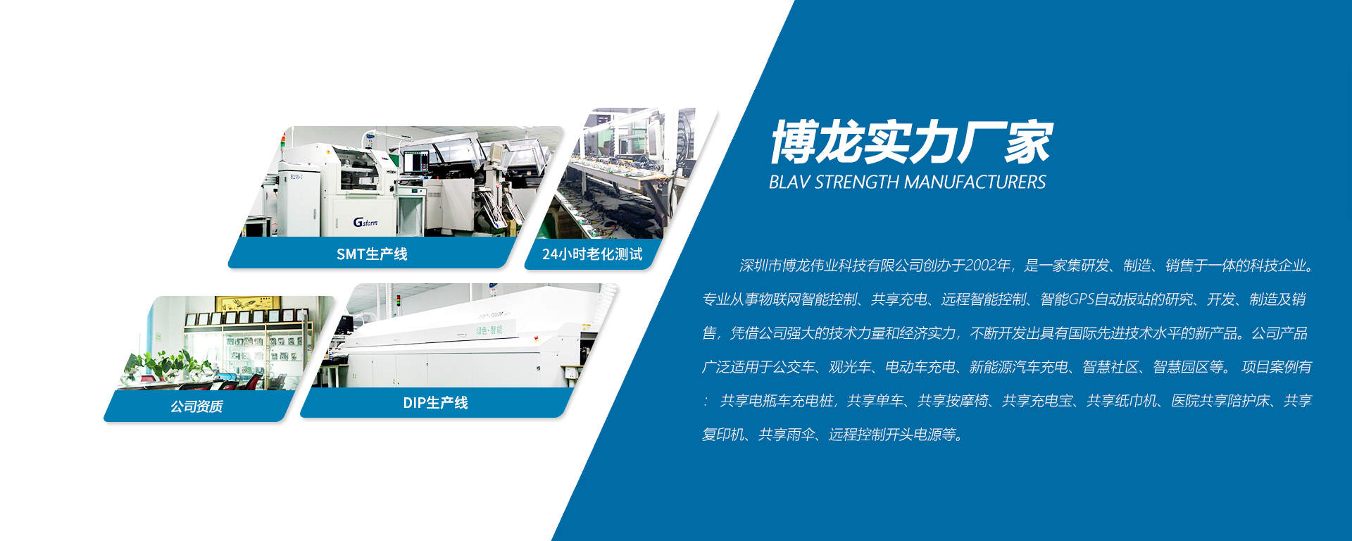 深圳市博龍偉業(yè)科技有限公司創(chuàng)辦于2002年,是一家集研發(fā)、制造、銷售于一體的科技企業(yè)。專業(yè)從事物聯(lián)網(wǎng)智能控制、共享充電、遠程智能控制、智能GPS自動報站的研究、開發(fā)、制造及銷售,憑借公司強大的技術(shù)力量和經(jīng)濟實力,不斷開發(fā)出具有國際先進技術(shù)水平的新產(chǎn)品。公司產(chǎn)品廣泛適用于公交車、觀光車、電動車充電、新能源汽車充電、智慧社區(qū)、智慧園區(qū)等。 項目案例有: 共享電瓶車充電樁,共享單車、共享按摩椅、共享充電寶、共享紙巾機、醫(yī)院共享陪護床、共享復印 機、共享雨傘、遠程控制開頭電源等。